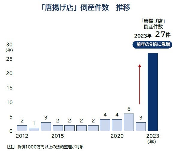 2023年は唐揚げ店の倒産がかつてないペースで急増した。持ち帰りを中心とした「唐揚げ店」経営業者の倒産は、同年に27件発生した。前年の9倍に達し、これまで最多だった21年(6件)を大幅に上回って過去最多を更新した。倒産した唐揚げ店は、オリジナルブランドの唐揚げ店のほか、大手唐揚げチェーンのFC店、本業以外のサブビジネスとして唐揚げ事業に参入した事業者など様々だった。ただ、倒産した事業者の多くが1~2店舗を展開する小規模な経営業者で、水面下の閉店や廃業などを含めれば、より多くの唐揚げ店が市場から退出したとみられる。