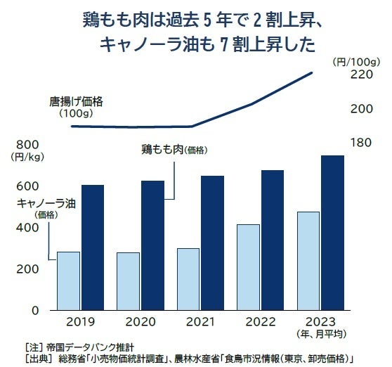 2023年は、唐揚げビジネスにとって非常に厳しい1年となった。唐揚げの原材料として使用される輸入鶏肉は、鳥インフルエンザの流行で供給量が減少した。また、飼料価格の高騰で牛肉・豚肉価格が上昇し、割安な鶏肉を求める消費国が増えたことも重なり、国内の鶏もも肉卸売価格は5年間で約2割上昇した。調理に必要な食用油も、キャノーラ油では5年間で約7割値上がりし、価格転嫁が難しい小規模店の経営にとって打撃となった。