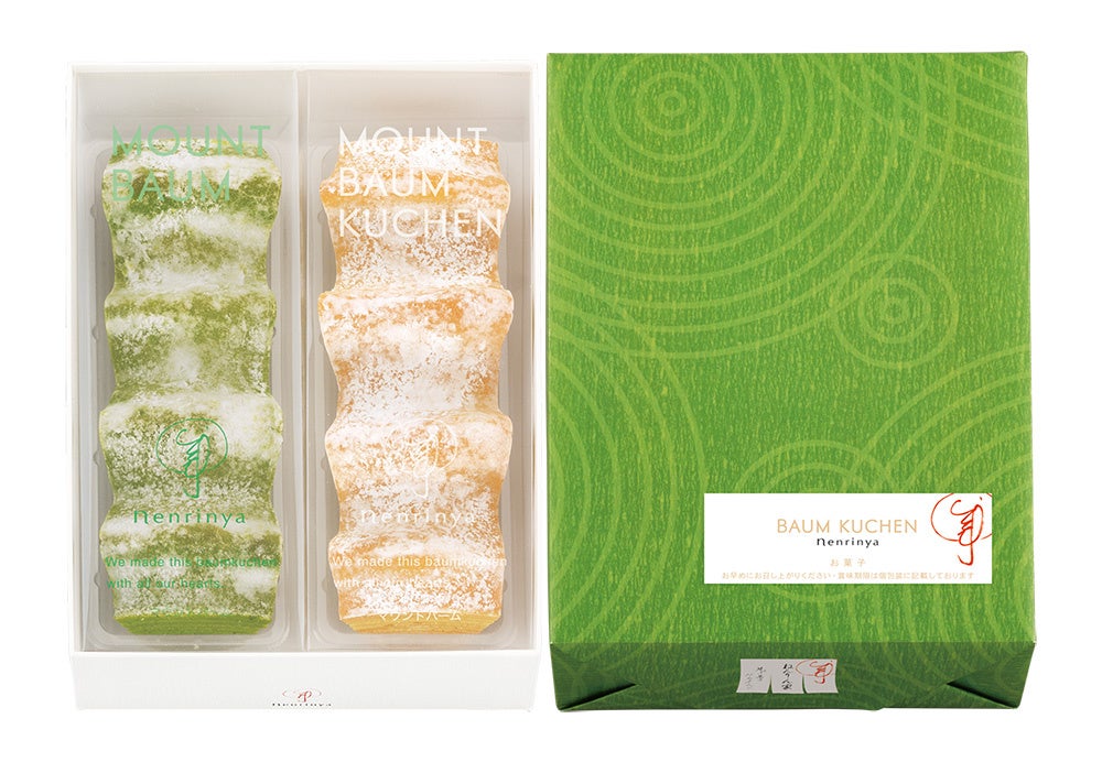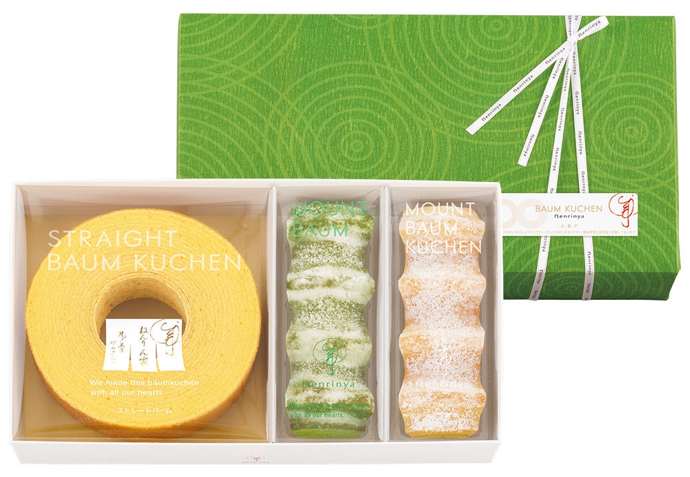 ねんりん家、初夏の詰合せ。濃厚なバター香る代表作「マウントバーム しっかり芽」。芳醇宇治抹茶⾹る「マウントバーム お抹茶」。ふっくらジューシーな「ストレートバーム やわらか芽」。