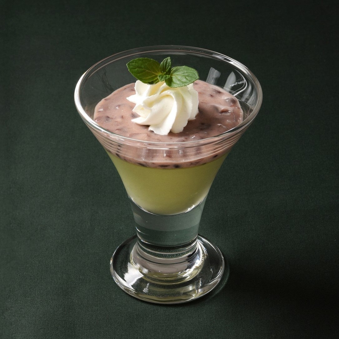 抹茶味のパンナコッタに小倉クリームをトッピングしました。お食事後のデザートにおすすめです。