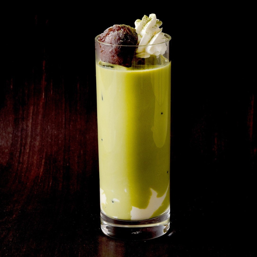 宇治抹茶を使用した抹茶ベースに濃厚なミルクを注いで、パンナコッタと小倉あんを合わせました。トッピングをよく混ぜてお召し上がりください。