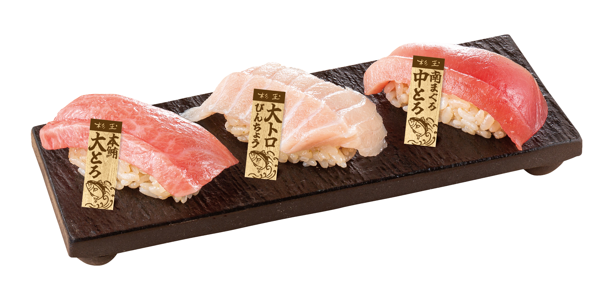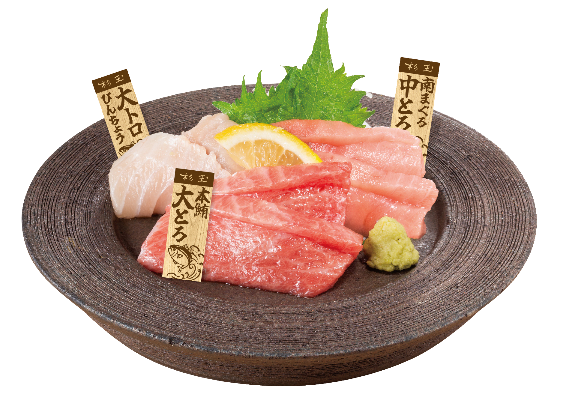目玉商品は、まぐろの王様「本鮪 大とろ」です。上質な脂とまぐろの旨みを楽しめる「本鮪 大とろ」を、多くのお客さまにお手頃にお召し上がりいただきたく、期間限定で特別価格にて販売いたします。さらに、とろだけを集めた「欲張り、とろ尽くし3貫」や、「まぐろの“とろ”だけ刺身盛り」もおすすめです。バイヤーがこだわって仕入れた本鮪大とろと南まぐろ中とろ、大トロびんちょうを贅沢に一皿でお楽しみいただけます。また、2024年2月に誕生した、ネタとシャリの間に隠し味を忍ばせた“お忍び寿司”から新たに「大トロびんちょう 旨辛炙り」が登場します。ピリっと辛い柚子辛味噌を塗った大トロびんちょうを軽く炙り、香ばしく仕上げました。杉玉らしい組み合わせをお楽しみいただけます。