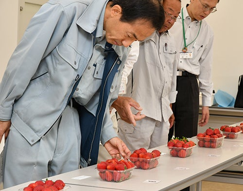 この日は市内の栽培農家18軒それぞれが選りすぐりのイチゴを出品し、品評会会場には甘い香りが立ち込めました。一次審査で、形、色つや、粒のそろい具合などから5点に絞られた後、糖度計を使用し糖度を測定し最終3点が入賞。優秀賞に畑中章さん(同市宮田町)が選ばれました。審査員を務めた大阪府北部農と緑の総合事務所・企画調整総括の林さんは「今年は日照時間が短く、3月の寒暖差が大きかったなどイチゴ作りに難しい環境だったが、皆さんの努力で多くの素晴らしいイチゴを出品していただきました」と評価していました。