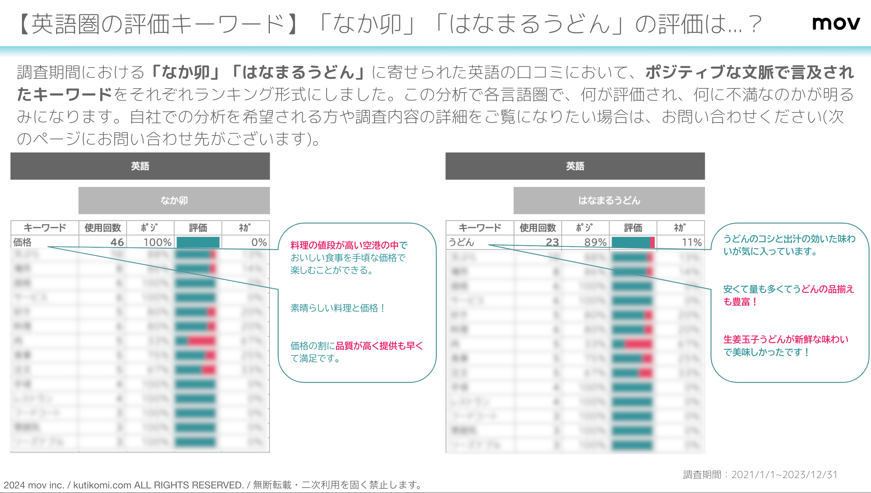 調査期間における「なか卯」「はなまるうどん」に寄せられた英語の口コミにおいて、ポジティブな文脈で言及されたキーワードをそれぞれランキング形式にしました。