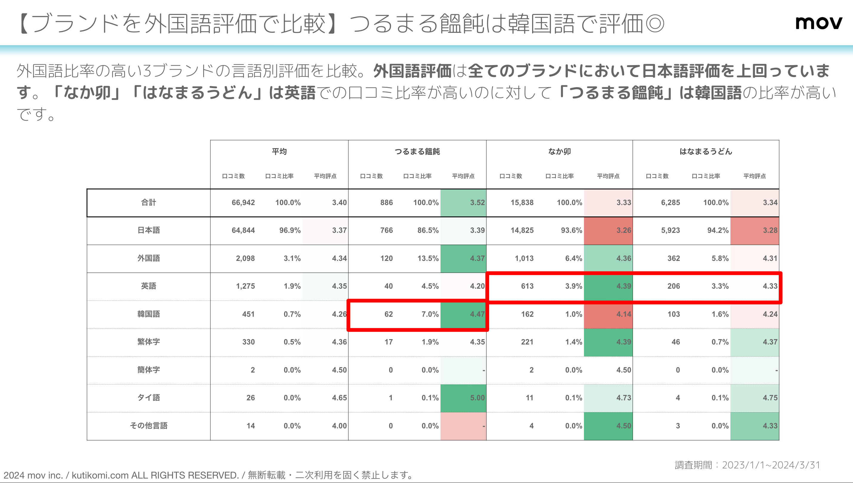 「なか卯」「はなまるうどん」は英語での口コミ比率が高いのに対して「つるまる饂飩」は韓国語の比率が高いことに加え、評価としても高い数値を示しています。