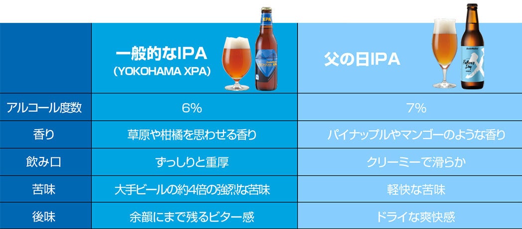父の日IPAはYOKOHAMA XPAより多くのホップ使いながらも、その投入タイミングを通常の麦汁煮沸“中”ではなく煮沸“後”に集中させることで、ホップの苦味は軽やかでパイナップルや柑橘などのフルーツを思わせるホップアロマを凝縮させたビールになっています。