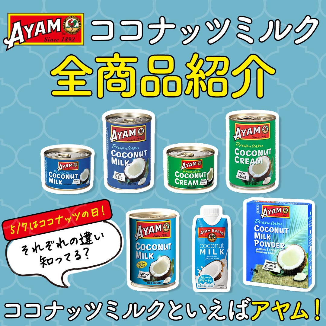 「ココ(5)ナ(7)ッツ」と読む語呂合わせで制定されたココナッツの日。アヤムでは東南アジアの食卓にかかせないココナッツミルクを豊富にラインナップしています。