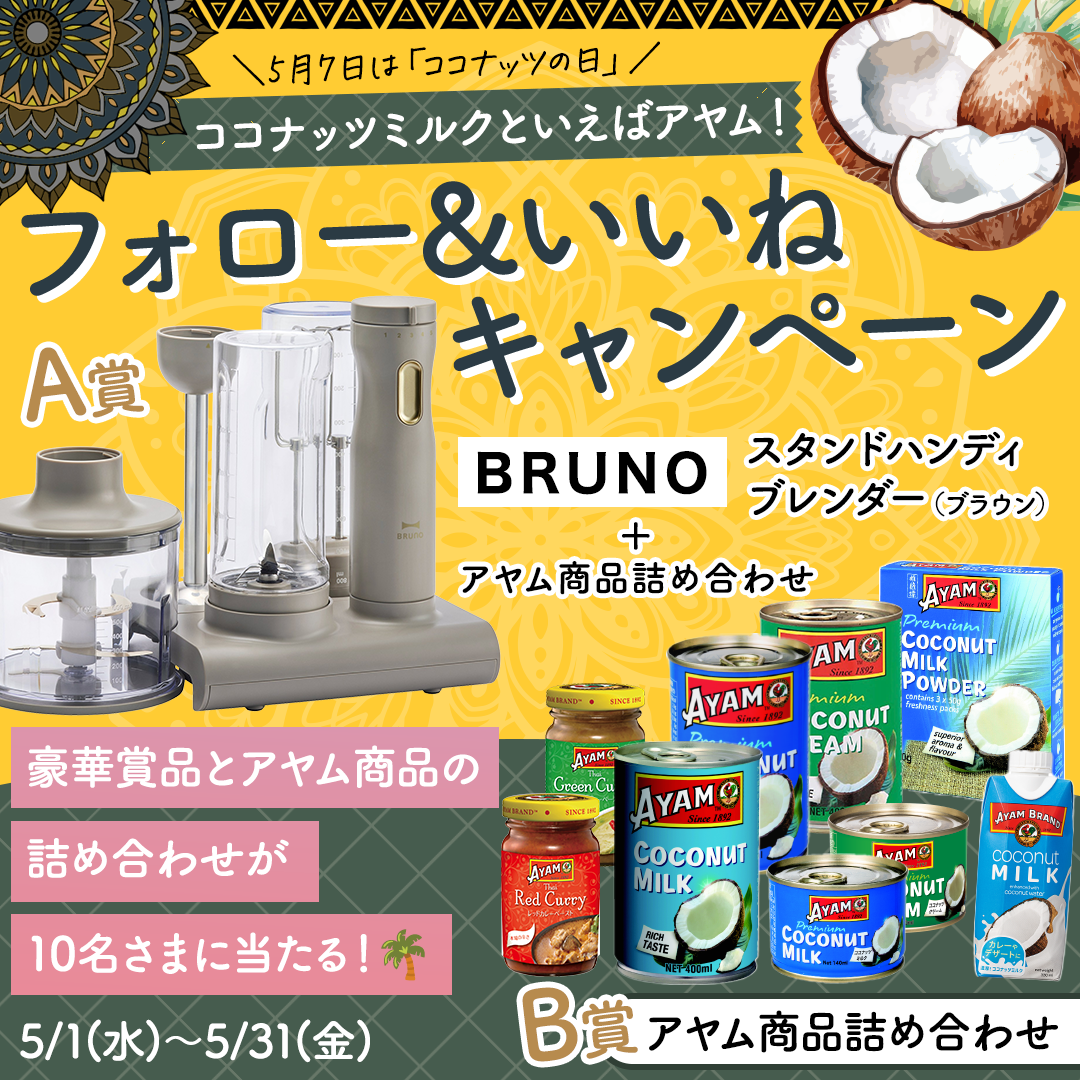 今回はそんなアヤムのさまざまなココナッツミルクをぜひお試しいただき、お気に入りを見つけていただくきっかけにしていただくため、ココナッツの日を含む5月を応募期間とするキャンペーンを開催しております。