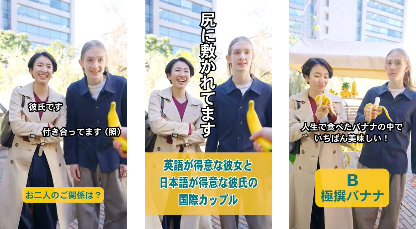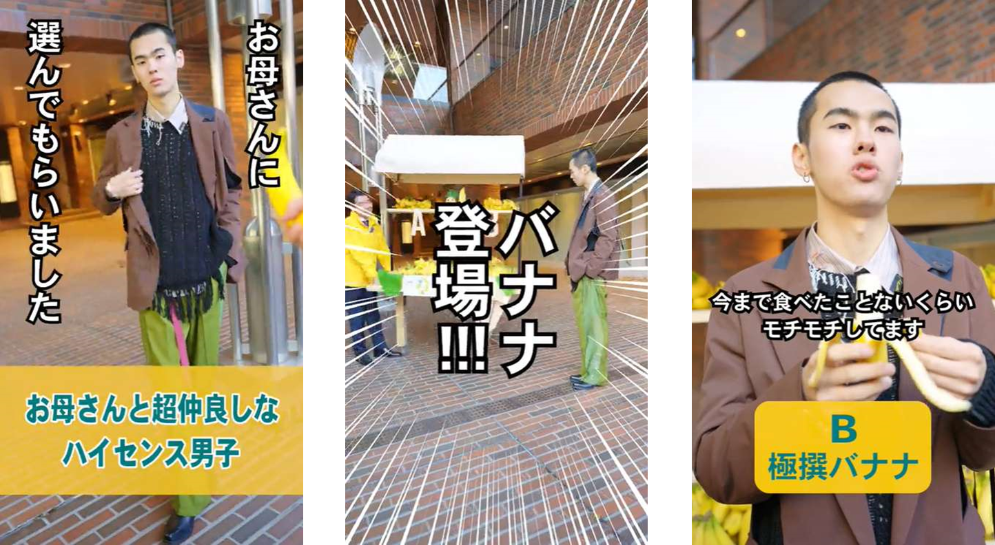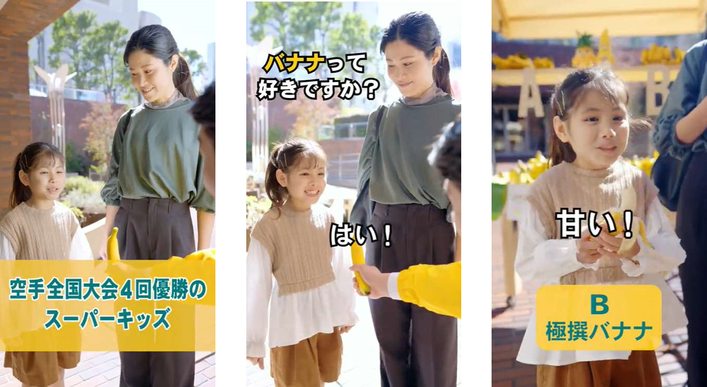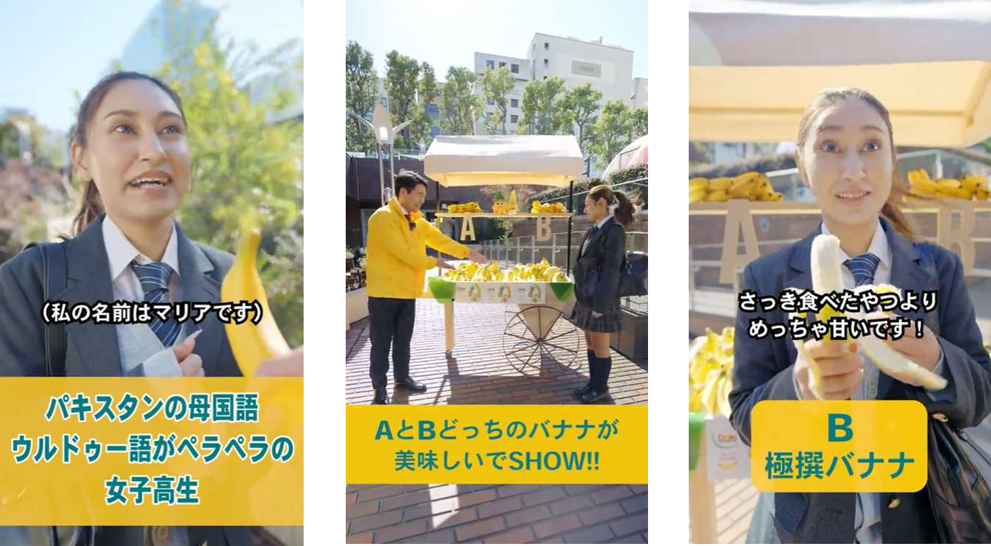 5月9日から、合計5本の動画コンテンツを公開いたします。動画では、幅広い層の方に一般のバナナと『Dole極撰バナナ』を比較していただき、「どちらがおいしいか」の生の声をお聞きする内容となっております。