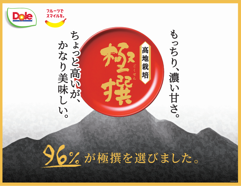 『Dole極撰バナナ』とは、Doleが研究・開発した100種以上の苗の中から選び抜かれた甘み、香り、食感、すべてが高品質なバナナです。販売開始から15年、もっちり濃い甘さの高地栽培バナナとして多くのお客様から愛され続けている商品です。