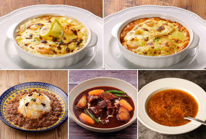 ビーフジャワカレー×2、ビーフシチュー×2、フレンチオニオンスープ×2