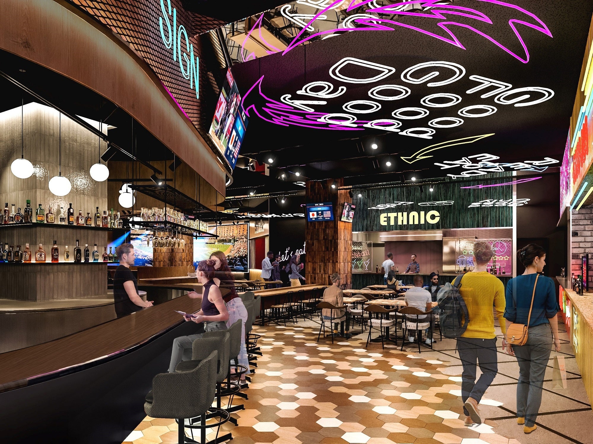 フードホール内は、照明を落としてネオンが光る、大人がお酒を楽しめる空間を演出。また、館内に設置した巨大LEDビジョンと大小多数のモニターでは、スポーツやエンタメコンテンツを放映します。エンターテインメントシティならではの臨場感、わくわく感を感じながら、様々な客席を自由に選べるスタイルで、11店舗の多種多様なグルメを提供します。