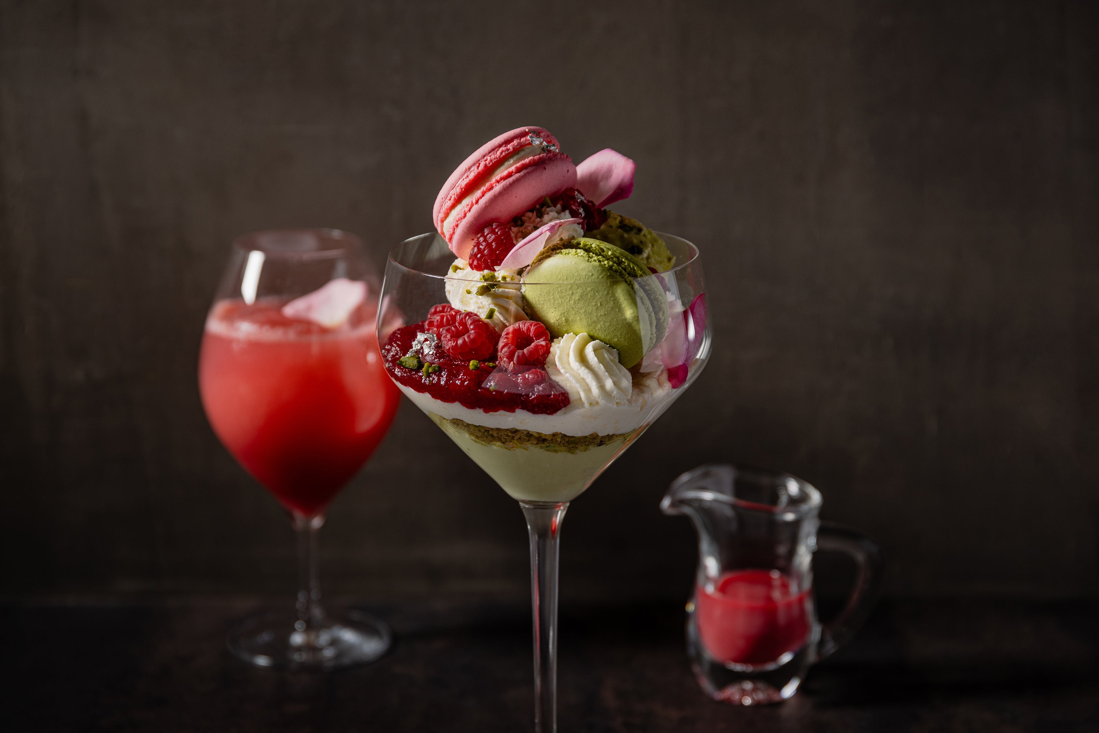 プロデューサー林のパティシエ人生の原点とも言える「マカロン」をこだわり抜いたレシピで仕上げ、ピスタチオ、フランボワーズの2種類をベースにアーモンド菓子であるマカロンのナッティな風味とピスタチオの濃厚な自家製アイスクリーム、フランボワーズとライチとローズを合わせたソースが美しく華やかな余韻を感じさせる芸術的なパフェ。ピスタチオとフランボワーズの美しいマリアージュをお楽しみください。