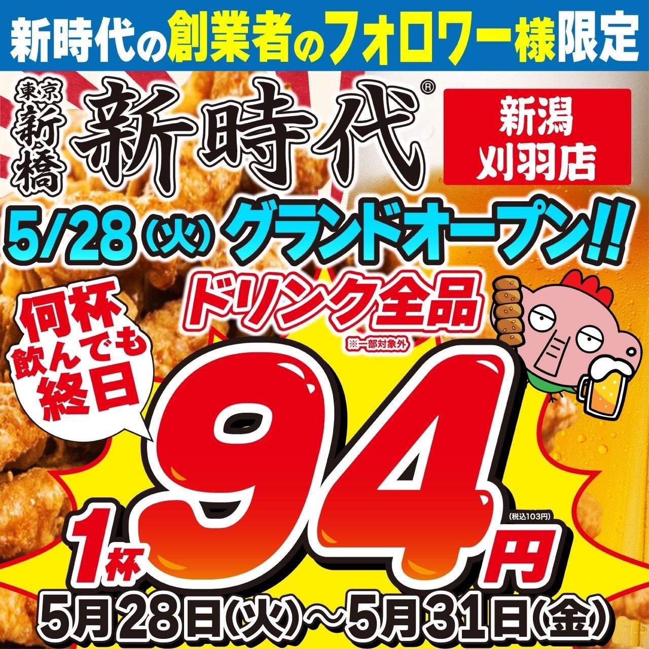 【5月28日(火)~5月31日(金)は、更にお得!】新時代の創業者のInstagramをフォローするだけで、何時でも、何杯飲んでも、ドリンク全品1杯94円のお得なセールを開催します!