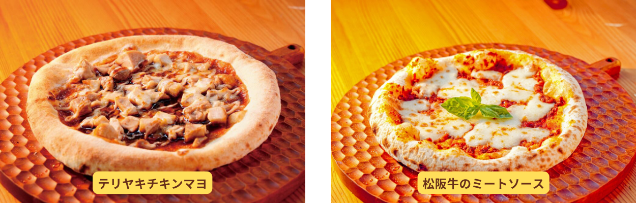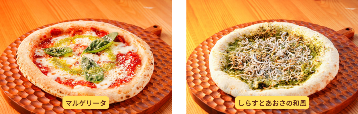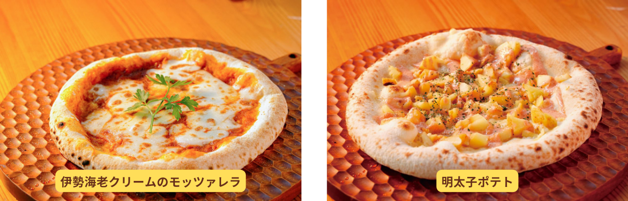 マルゲリータ、しらすとあおさの和風、はちみつ、松阪牛のミートソース、伊勢海老クリームのモッツァレラ、明太子ポテト、しらすとトマトの和風、ポテトスペシャル、テリヤキチキンマヨ、えびモッツァレラジェノバ、クアトロフォルマッジ、期間限定ピザ