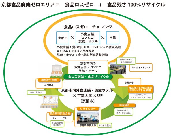参画する京都市内の外食店舗は、「京都市食べ残しゼロ推進店舗」の認定を受け、消費者へ食べ残しの持ち帰りの呼び掛け等の啓発活動をすることで食品ロスゼロへ向けて取り組み、それでも出てしまう食品ロスや食品残さは、食品リサイクル法に基づく再生利用事業計画の取り組みの一環である「食品リサイクルループ」制度を利用し、共同回収し、飼料へリサイクルし、生産された鶏卵を参加企業で買い戻しをすることで食品リサイクル100%へ向けた取り組みを行っています。