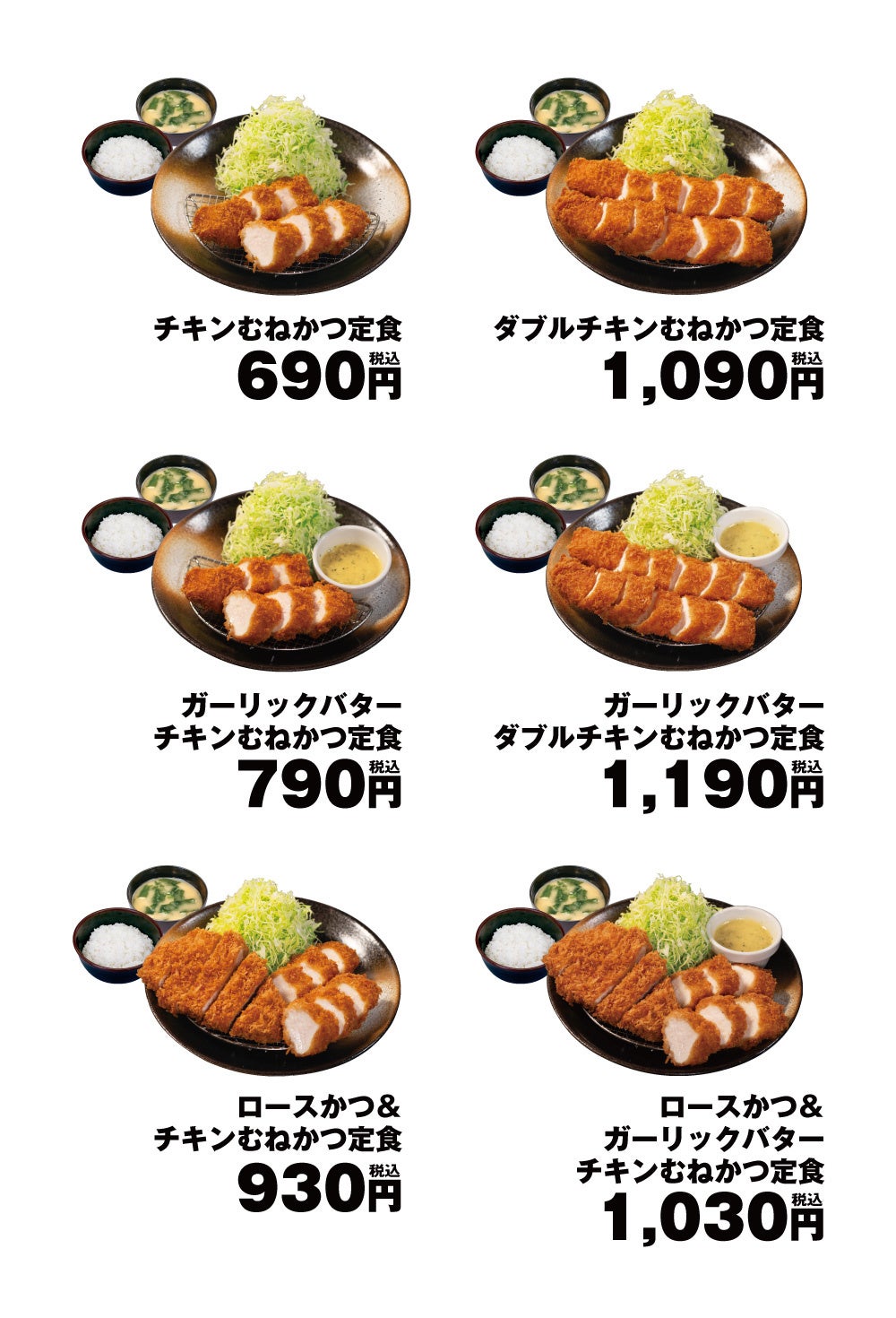 商品名 チキンむねかつ定食 690円 ダブルチキンむねかつ定食 1,090円 ガーリックバターチキンむねかつ定食 790円 ガーリックバターダブルチキンむねかつ定食 1,190円 ロースかつ&チキンむねかつ定食 930円 ロースかつ&ガーリックバターチキンむねかつ定食 1,030円 単品チキンむねかつ 450円 ※お持ち帰りいただけます。お持ち帰りのみそ汁は、別途60円でお買い求めいただけます。 ※全て税込価格です。また、店内・お持ち帰りの税込価格は同一です。 ※株主優待券は上記全てのメニューにご使用いただけます。(単品は除きます。) 発売日 2024年5月15日(水)午後3時 対象店舗 一部店舗を除く全国の松のや ※高速PA店舗、沖縄店舗を除く。 |