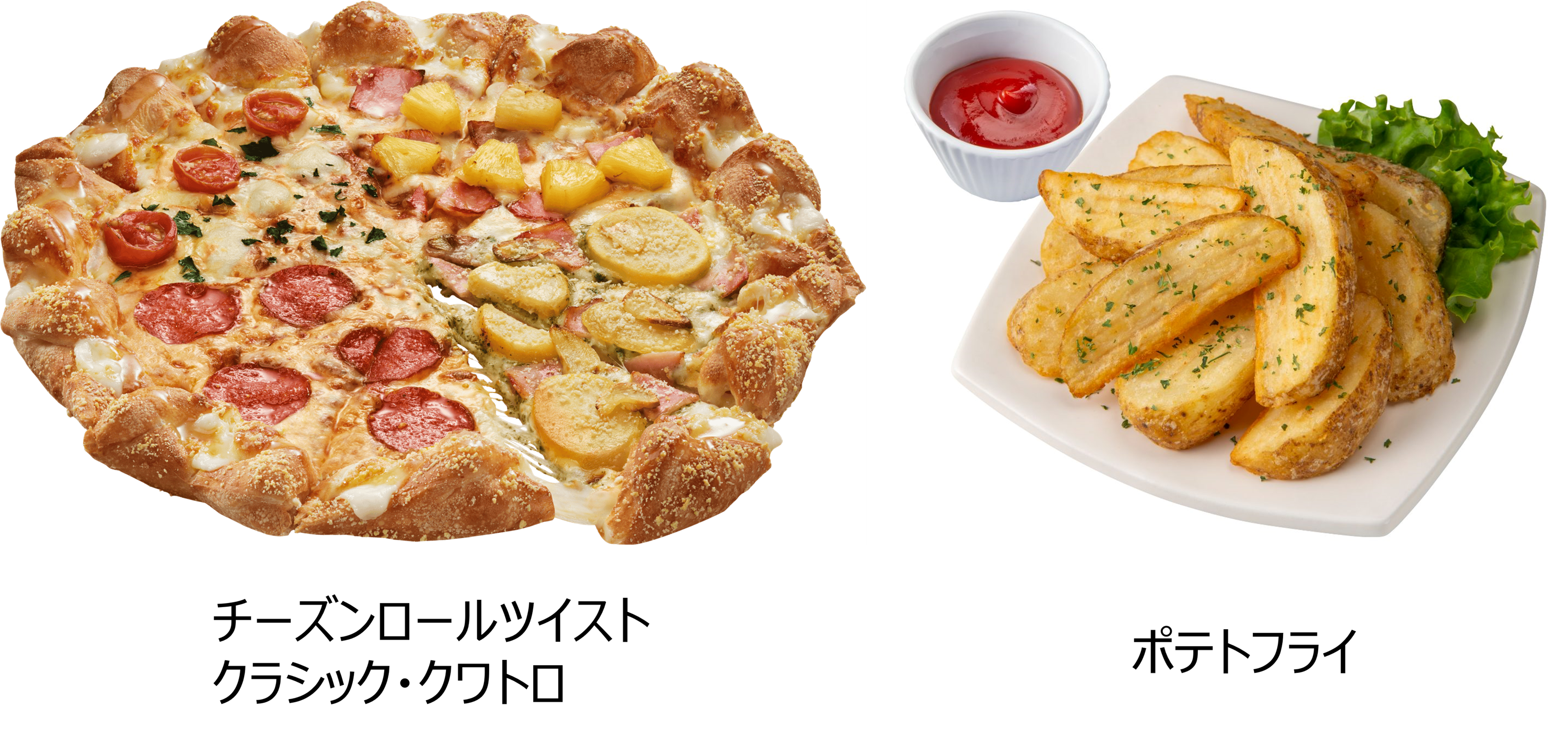 <オススメのピザ(選べる常時35種類以上)> ●チーズンロールツイスト クラシック・クワトロ チーズンロールツイストと特に相性が抜群な、人気の4種類を1枚で味わえるクワトロ・ピザです。とろけるチーズの味わいや、ガーリックバターオイルの香ばしさがプラスされ、いつもとは異なるおいしさを堪能できること間違いなしです。 ●クワトロ・2ハッピー プリプリのエビをたっぷりのせたマヨシュリンプ、常に不動の人気を誇るマルゲリータ、ドミノ・ピザ創業から続く看板商品ドミノ・デラックス、子どもから大人まで大人気の炭火焼チキテリの4つの味が楽しめるクワトロ・ピザです。 <オススメのポテトフライ(選べる4種類)> ●ポテトフライ ほくほく、サクッとした食感のポテトは大人気!サイドメニューの定番です。ケチャップをたっぷりつけてどうぞ。 ●コンソメポテトフライ サクッとした食感の皮付きポテトを、コクのあるコンソメ味に仕上げました。ついつい食べ過ぎてしまう後をひくおいしさです。 |