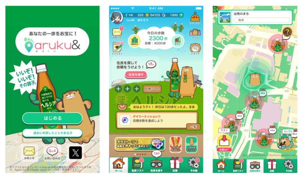ウォーキングアプリ「aruku&」は、花王の健康的な生活を応援する「ヘルシア」とのコラボキャンペーンを開催します。このキャンペーンは、“あなたの一歩が宝にかわる”というブランドコンセプトを持つ「aruku&」と、“ヘルシーをアシストする”という「ヘルシア」のブランドコンセプトが組み合わさることで、気軽に運動習慣を身につけたい方やさらに健康意識を高めたい方の取組みを応援し、これから運動を始める方のきっかけづくりになることを目指して実現しました。地図上に現れる住民キャラクター「ヘルシアくん」たちの依頼達成で獲得できる「応募カード」を集めると、抽選で「ヘルシア緑茶 350ml スリムボトル3本セット」や指定店舗・ECサイトで使えるクーポンが当たるプレゼントに応募できます。また、ヘルシアの公式LINEと友達になり合言葉を送ると、aruku&のアプリ内通貨「ポタストーン」がもれなく100個もらえます。