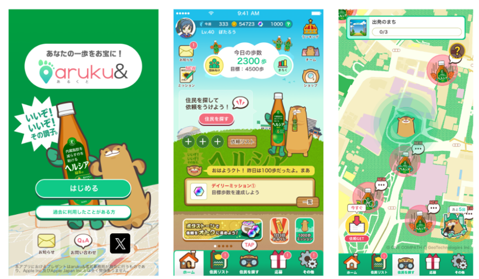 aruku&アプリ内の地図上にランダムでヘルシアキャラクターの「ヘルシアくん」をはじめ、3種が住民として登場。キャラクターに話しかけ、依頼された歩数(例:3時間以内に1000歩あるく)を制限時間内に達成すると応募カードがもらえます。応募カードをあつめると、「ヘルシア緑茶 350ml スリムボトル3本セット」や、指定店舗・ECサイトでお得にヘルシアを購入できるクーポンが抽選で合計6,100名(ヘルシア緑茶3本セット 600名様、クーポン5,500名様)にあたります。