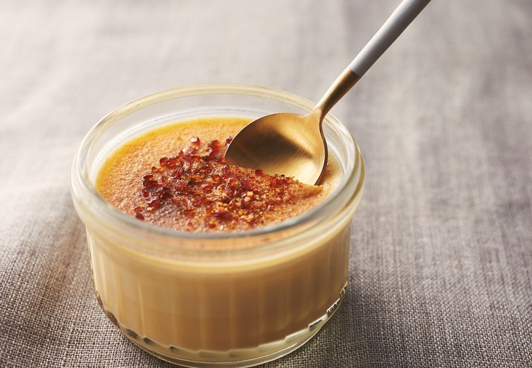 たまごとミルクの豊かな味わいのカスタードの天面を香ばしくブリュレ。別添の焦がしキャラメリゼのカリッとした食感と、ほろ苦い味わいがカスタードのおいしさを引き立てます。
