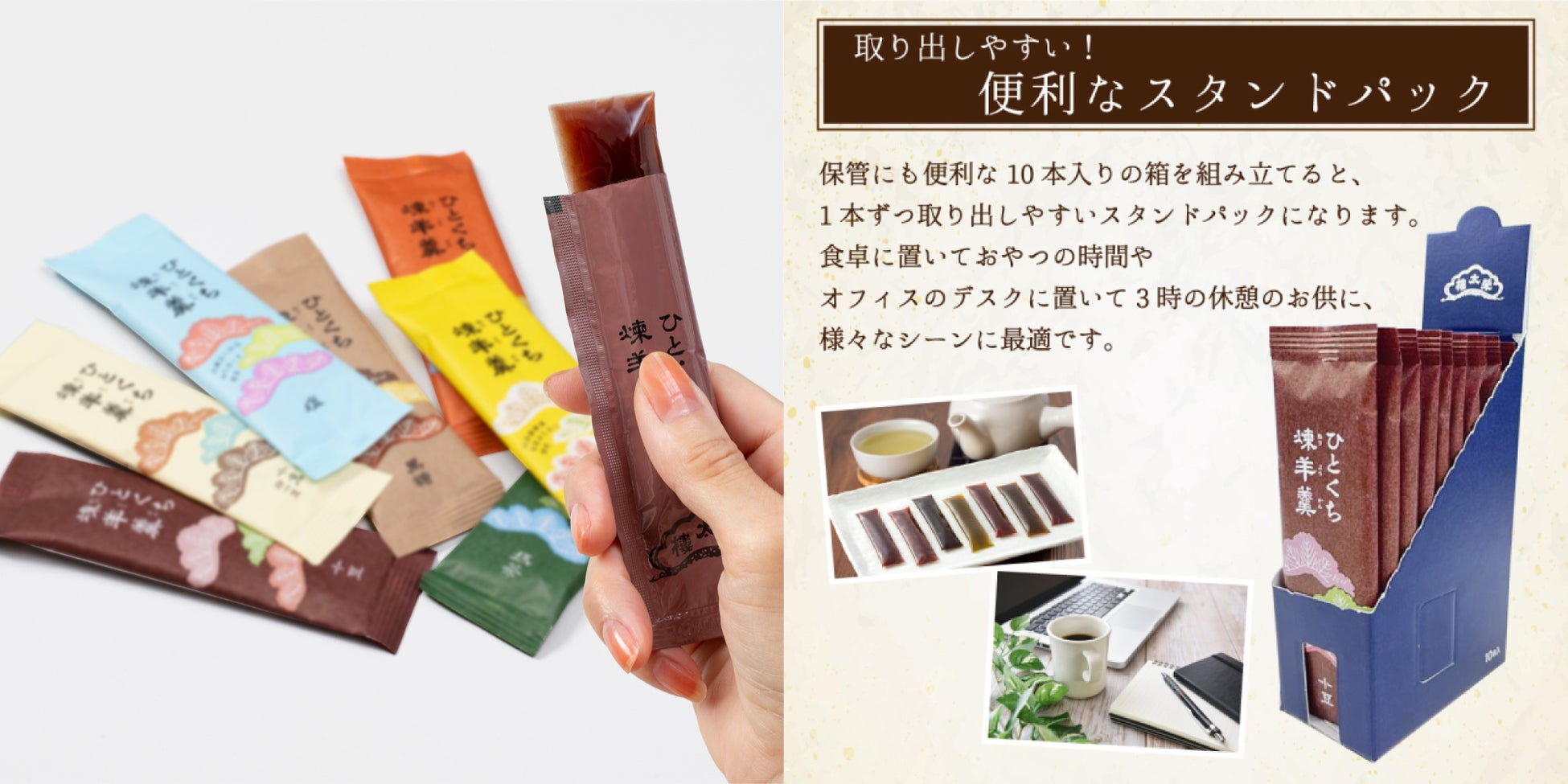 榮太樓伝統の製法で仕立てる羊羹を、切らずにどこででも手軽にお召し上がりいただけます。
