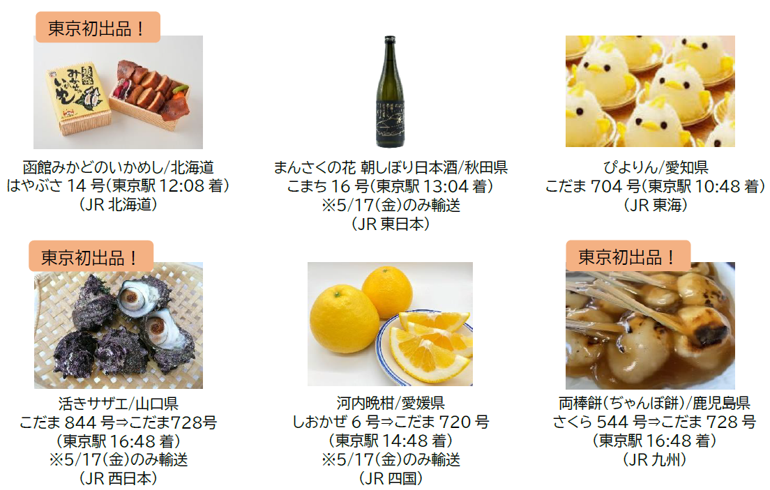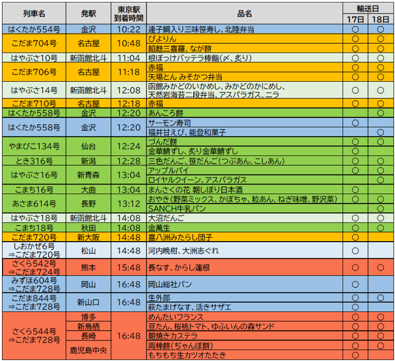 ○JRグループ6社では、「物流の2024年問題」や「CO2排出量削減」、「地方創生」など、社会的な課題解決の一助を担うことを目的に、新幹線などによる荷物輸送サービスに取り組んでいます。 ○このたび、各社の新幹線による荷物輸送サービスが開始し、新幹線の全区間 新函館北斗駅~鹿児島中央駅で各社のサービスがつながったことを記念し、JRグループ6社が荷物輸送サービスで初めて連携したイベント「新幹線でつながる旬食フェア」を東京駅で開催します。 ○新幹線の速達性とネットワークを活かし、各新幹線で次々と全国各地の特産品などを東京駅に輸送し販売します。また、会場では各社の新幹線による荷物輸送サービスのPRを行います。 |