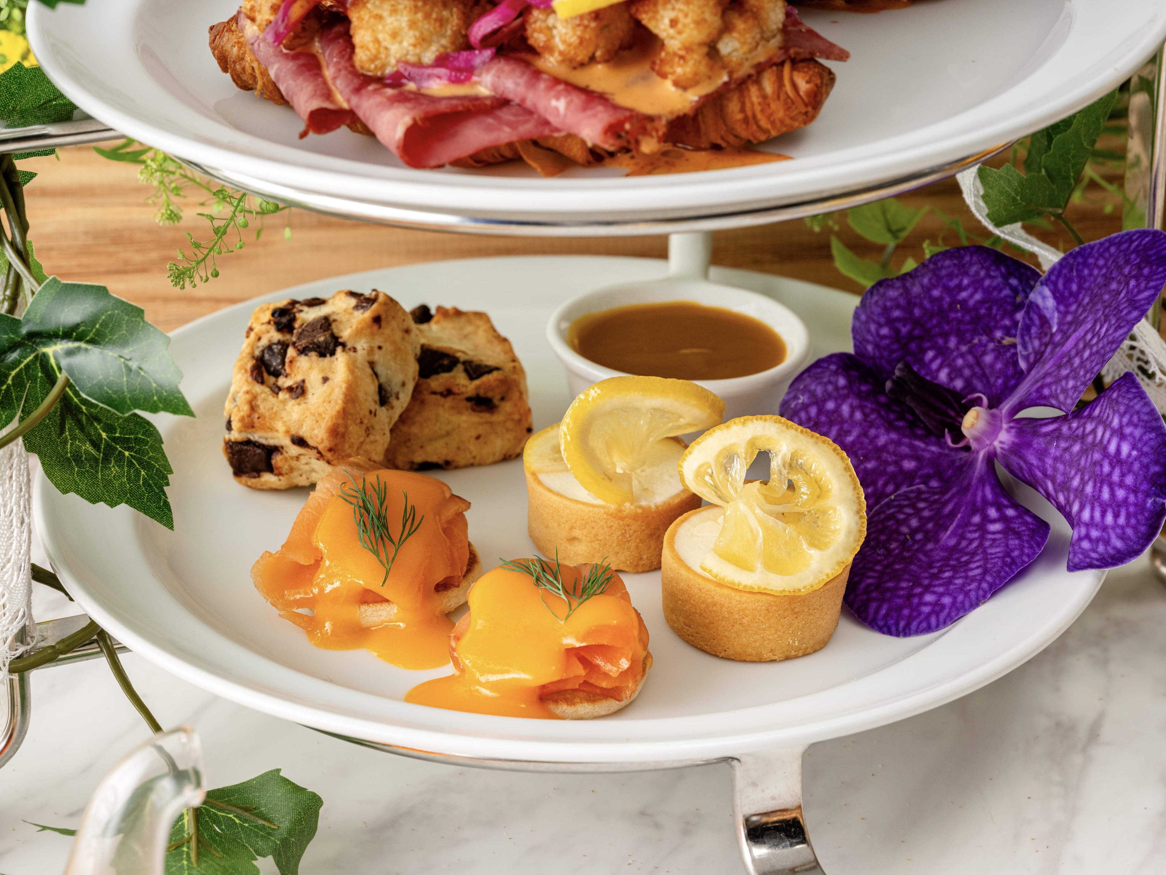 下段皿には、チーズとレモネードのタルト、パッションフルーツとマンゴーのジャムにつけて食べるショコラスコーン、スモークサーモンとトリュフ香る卵黄ソースのミニパンケーキをご用意いたしました。