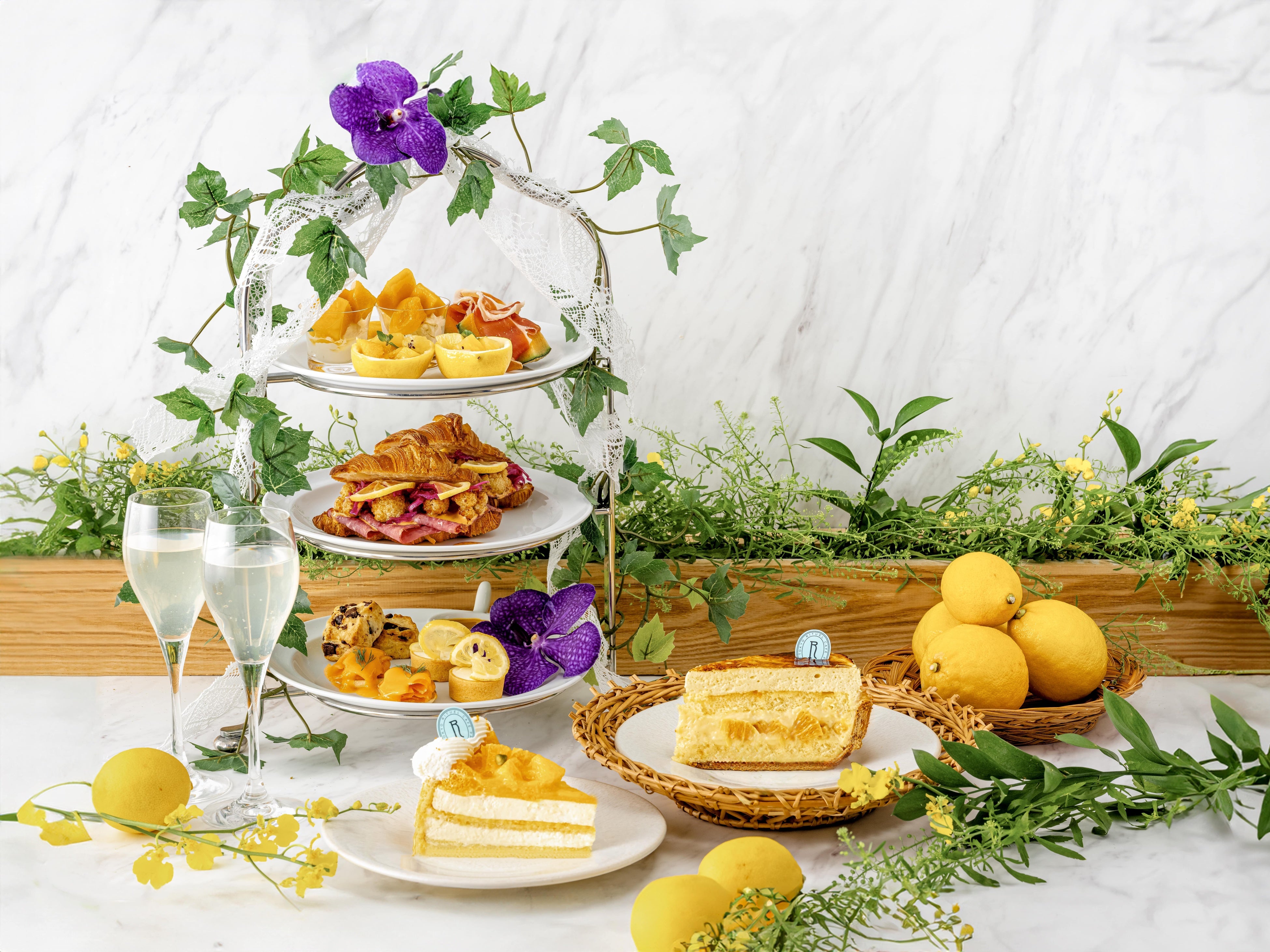 上段のお皿には、半分にカットしたレモンの皮の器にパイン、キウイ、オレンジを漬け込んだフルーツマリネ、さわやかなレモンの香りのマカロン、ジューシーなマンゴーと濃厚なチーズの味わいが楽しめるパルフェ、スパイスが香る生ハムメロンをご用意。