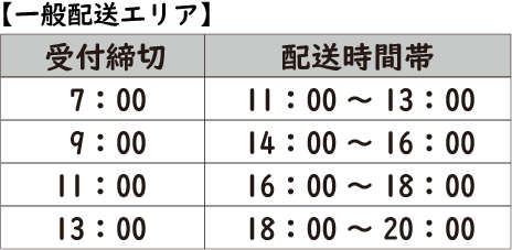 一般配送エリアの配送時間は、11:00~20:00の間の4つの時間帯から選択が可能で、13:00までの注文であれば、当日配送も可能です。