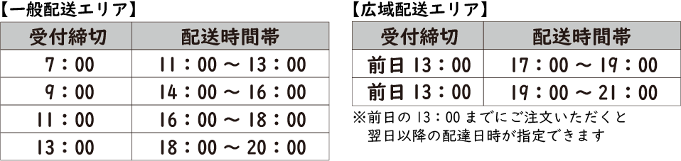 広域配送エリアの配送時間は、17:00~19:00と19:00~21:00の2つの時間帯で、注文締切が前日の13:00までとなっております。