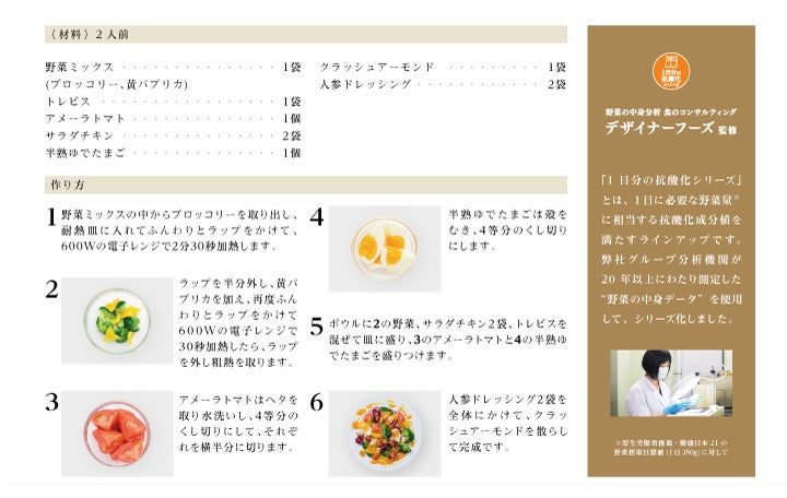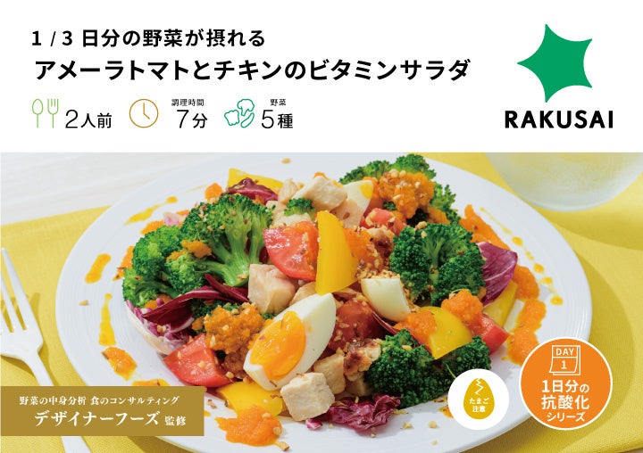 抗酸化ビタミンとよばれるビタミンA・ビタミンC・ビタミンEがカラダに嬉しい、お父さんの健康を気遣うサラダです。濃厚な甘みと程よい酸味が特徴のアメーラトマトに、「ごろっとサイズ」の野菜とチキン、ゆで卵を合わせた満足感のある一品です。