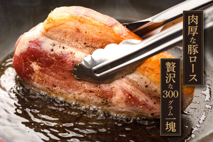 肉厚な国産豚ロースを贅沢に一塊300gご用意しました。じっくりと揚げ焼きした「肉汁がたっぷりでジューシーなお肉」に「新鮮な野菜」を添えてお楽しみください。切り分けてみんなでシェアしながら、お召しあがりいただけます。