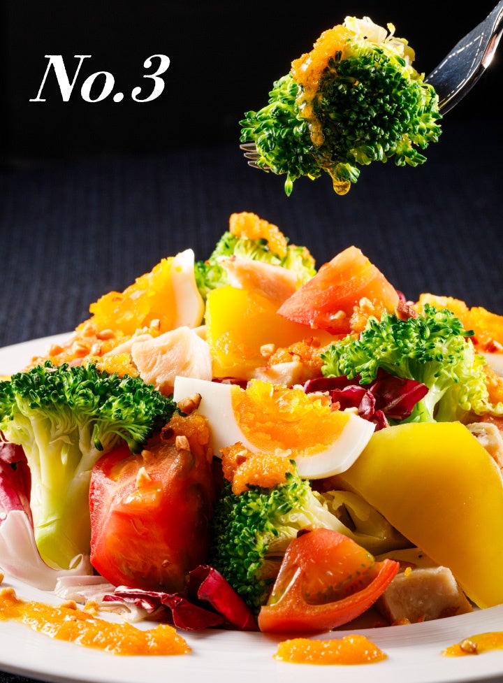 オリーブ油で仕立てた甘みのある特製人参ドレッシングをかけてお召しあがりください。