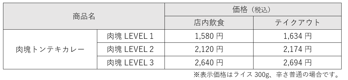 「肉塊トンテキカレー」は、ご注文時に肉塊レベルをお選びいただく「肉塊オーダー制」です。肉塊LEVELは、豚肩ロース肉の大きさを表しており、LEVEL1~3まで3段階のサイズをご用意しました。