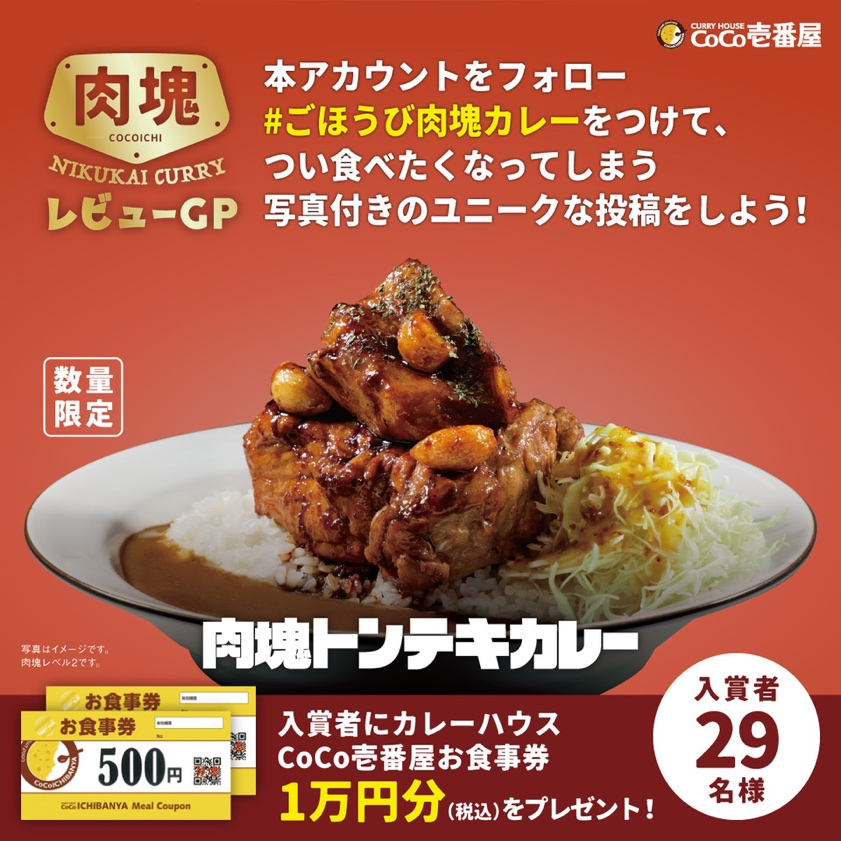 「肉塊トンテキカレー」の販売に合わせて、「肉塊レビューGP(グランプリ)」を開催いたします。「肉塊トンテキカレー」の写真と「#ごほうび肉塊カレー」をつけて、X(エックス)にポストしてください。より多くの5月疲れを感じる方へ「ごほうび肉塊カレー」の情報を届けてくれた、そんなバズ投稿を表彰します。厳正なる審査の上、入賞者29名様にカレーハウスCoCo壱番屋お食事券1万円分(税込)をプレゼントいたします。