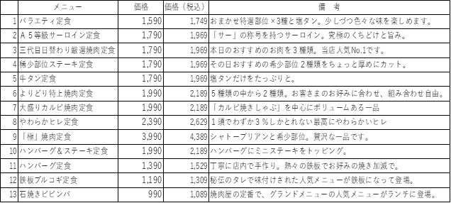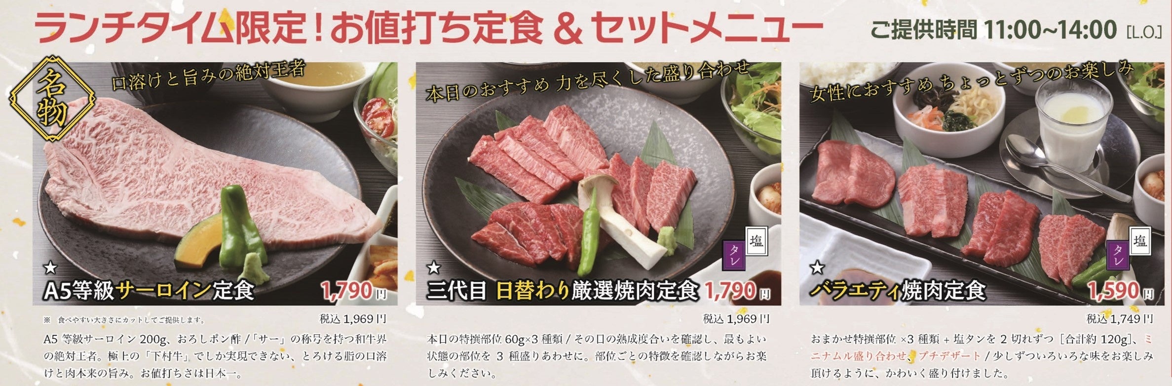 メニューをブラッシュUPしたほか、「贅沢したい日に食べたいメニューが欲しい」「いろいろなお肉をちょっとづつ味わいたい」という女性を中心としたお客さまのご要望にお応えした「『極』焼肉定食」や「バラエティ定食」、2024年2月に期間限定で販売し、人気の高かった「プルコギ定食」をアツアツで食べられるように鉄板メニューに改良するなど「下村牛」の 「あふれる旨み」「究極のくちどけ」「やわらか食感」でお昼の楽しい時間を過ごして頂けるようランチメニューを全13種類揃えました。