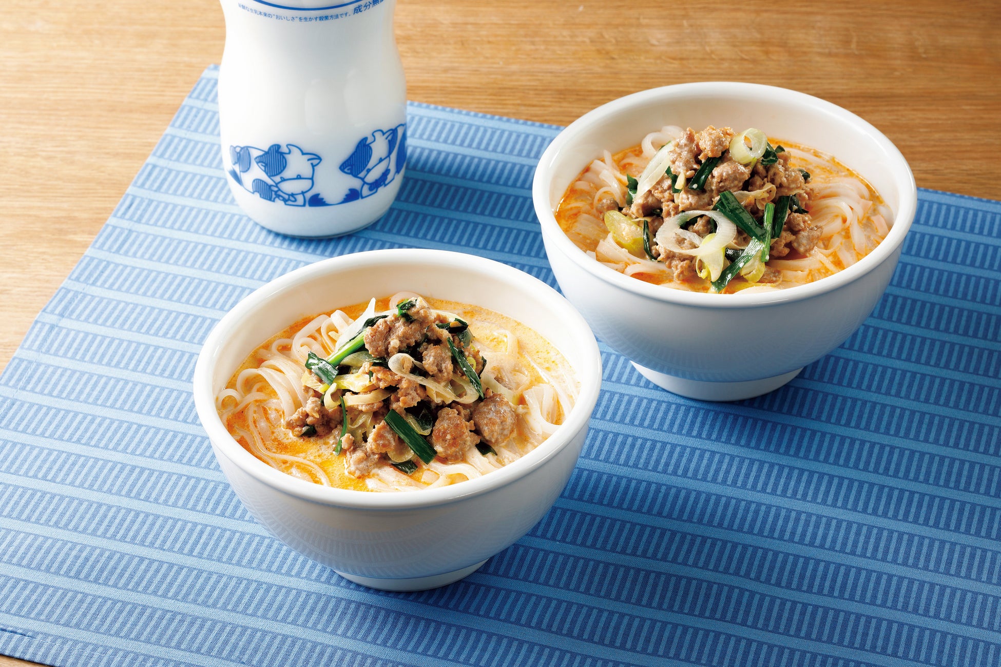 生活クラブでは酪農家支援のためのさまざまな施策に取り組んでおり、「牛乳で作る旨辛担々フォー」は、料理に使用し消費することを通じて応援しようと誕生しました。 1人当たり、たっぷり250mlの牛乳を使用したメニューで、成人女性が一日に摂りたいカルシウムの約4割が摂れます。(※)