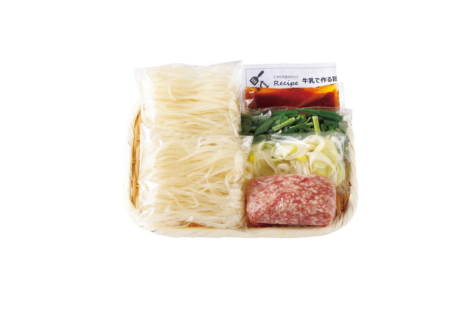「牛乳で作る旨辛担々フォー」は、本格的な辛味と旨味のある添付調味料(火鍋の素)に牛乳を合わせることで、家庭では簡単につくれないコク深い味わいを実現しました。平田牧場「日本の米育ち三元豚」の豚肉ひき肉と長ねぎ、にら、フォーがセットになっており、家庭で用意するものは牛乳となたね油、味噌、水だけです。付属のレシピに従い、約10分でできあがります。