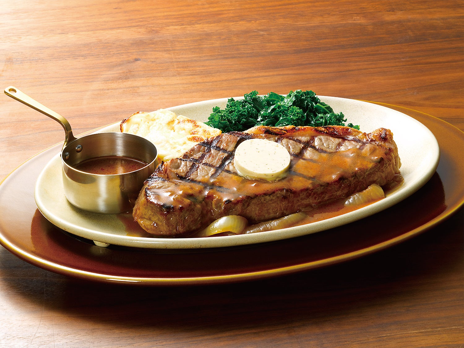 アメリカフェアにて好評だった300gの厚切りステーキ。今回グランドメニューでも100gから150gへ、200gから300gへ増量しました。コーンベルト地帯で育ったアンガス牛ならではの赤身と甘みのある脂身のバランスが良く、コクのある豊かな味わいをお楽しみいただけます。また、付け合わせはポテトグラタンへ変更しました。