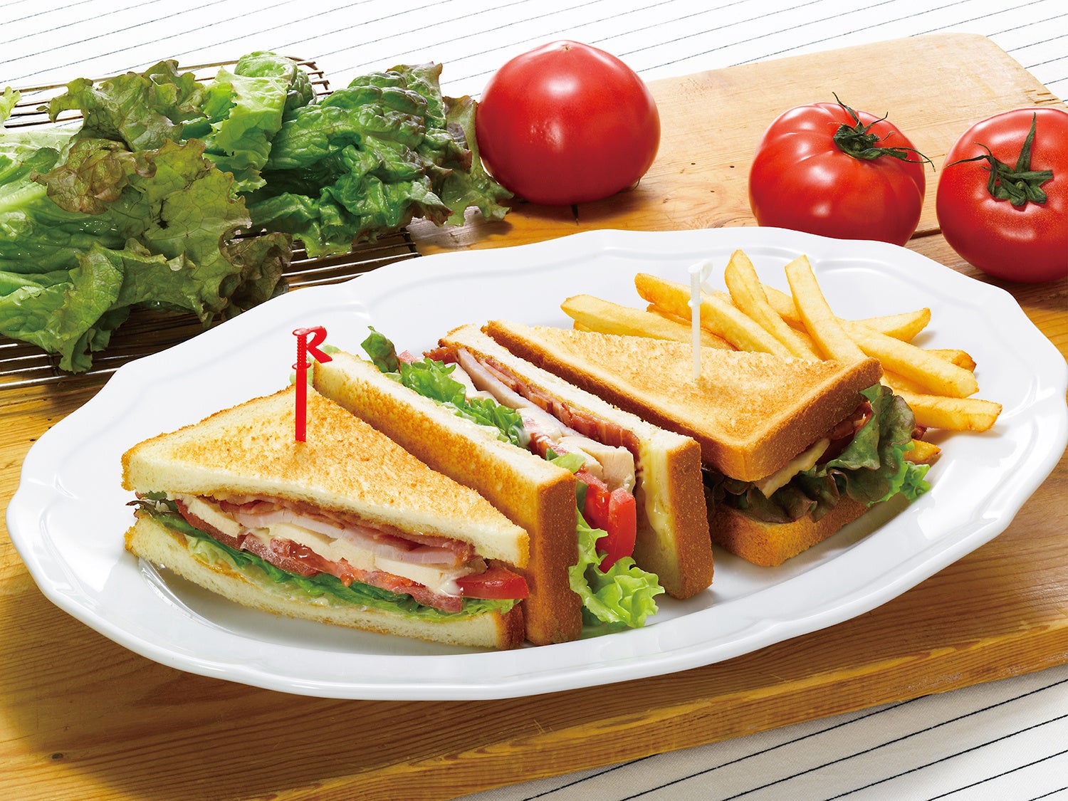 レタス・トマト・ハム・ベーコン・チキンを、トーストした食パンではさんだ、アメリカンスタイルのサンドイッチです。増量した具材とパンとのバランスがよく、より食べ応えのある味わいにリニューアルしました。