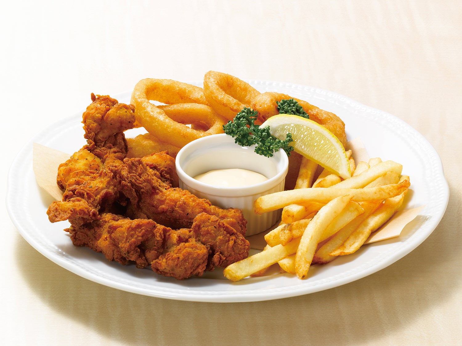アメリカフェアで好評だった商品がグランドメニューに仲間入り。カリっと香ばしいオニオンリングとジューシーなフライドチキンに、フライドポテトをセット。アイオリクリームソースをつけたり、さっぱりとレモンを搾ってお召し上がりください。