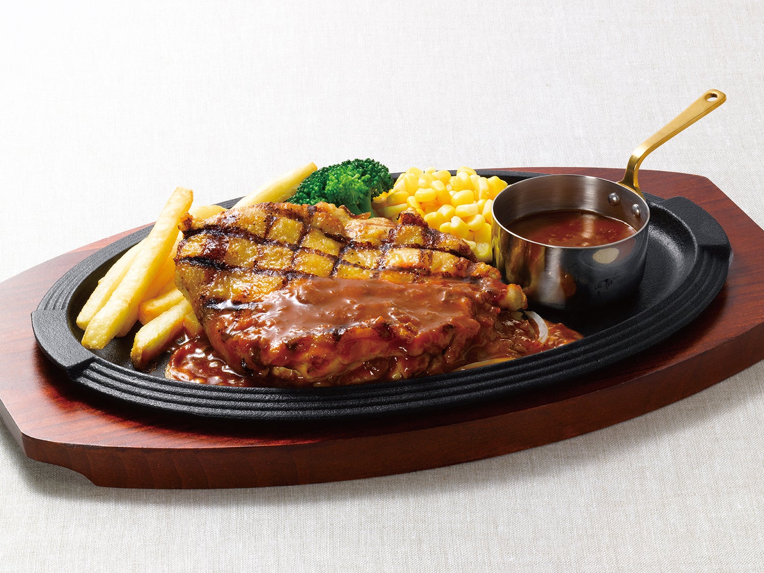 お客様の好みに合わせて、お肉の量を75gまたは150gから、スープは定番のオニオングラタンスープまたはオマール海老のクリームスープ(+130円)からお選びいただけるようになりました。また、ガーリックトーストに替わり、ジュレ&フラン仕立てをお付けしました。