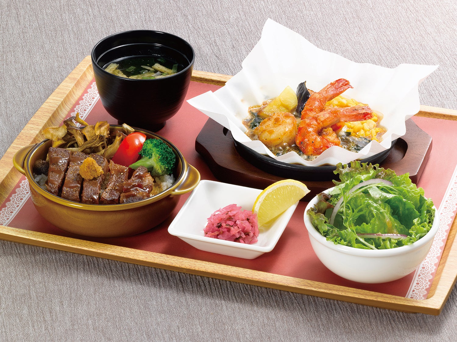 黒毛和牛ステーキご飯&海老と帆立のあつあつグリル(サラダ・味噌汁・漬物付)