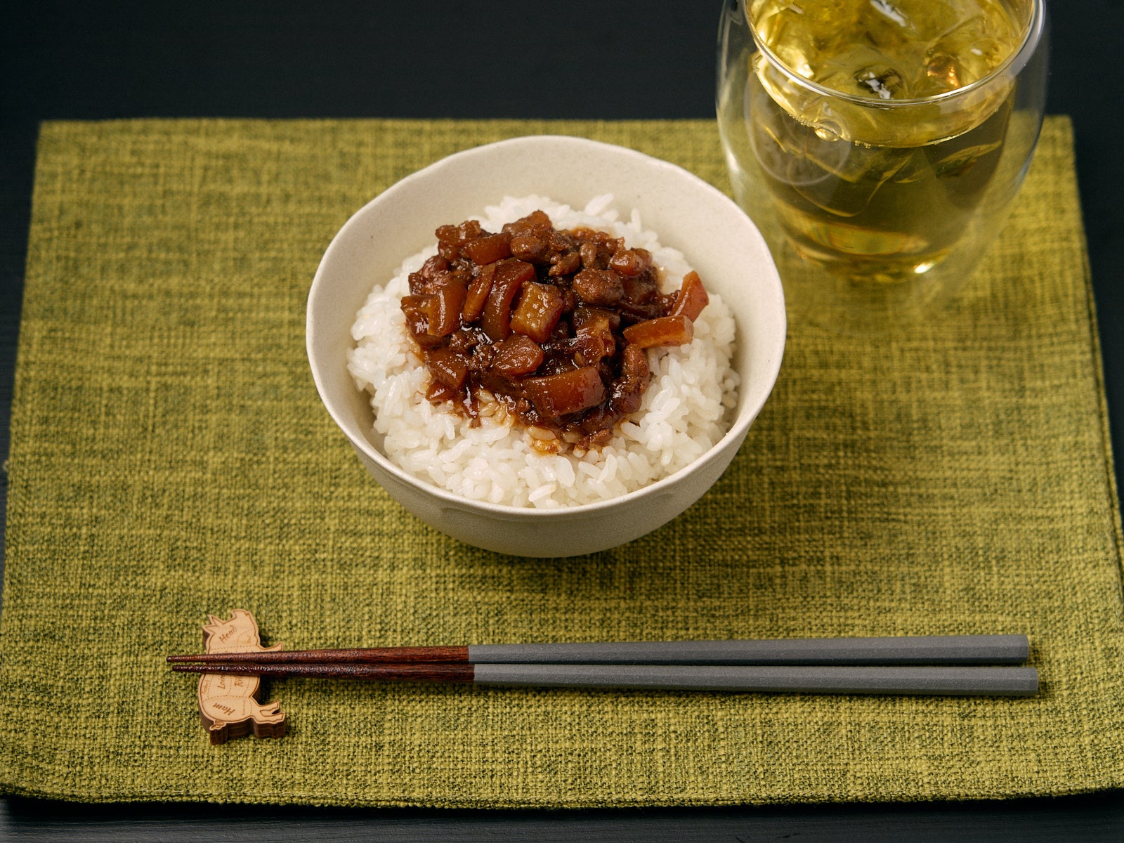 台湾の滷肉(ルーロー)と日本の角煮の違いは、豚肉に皮を使うかどうかです。一般的に日本の市販の三段バラ肉は皮を取り除きますが、台湾の滷肉は皮を残し、そのコラーゲンとゼラチンを利用 して滷肉に粘り気を与えます。この粘り気によって、醤油の香りがさらに閉じ込められ、食べる人にも皮特有のゼラチンの食感を楽しむことができます。当店の滷肉は皮の美味しさをそのまま残しているので、お客様にじっくりと味わってもらえます。