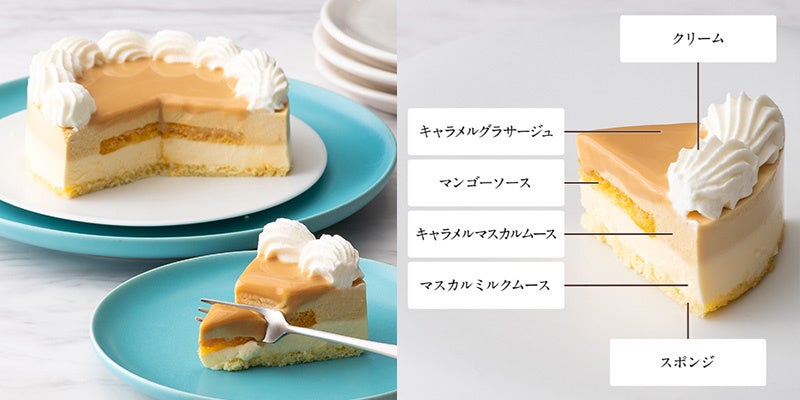 ミルク感豊かであっさりとした甘さのマスカルミルクムースに、ほんのり香ばしいキャラメルマスカルムースを重ねました。とろりととろけるキャラメルグラサージュが、うっとりとした余韻を生み出します。