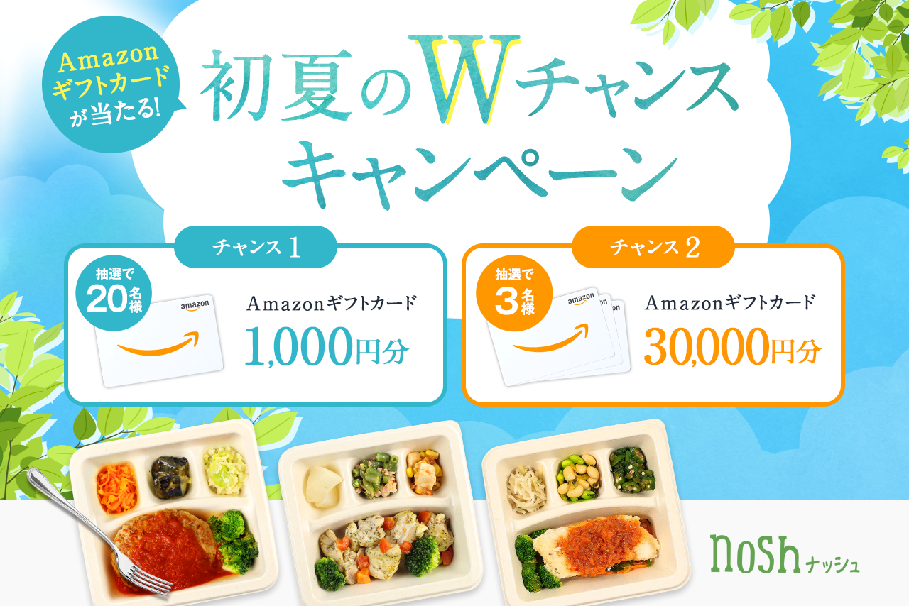 対象期間中にナッシュ公式SNSからキャンペーンに参加いただくと、抽選で20名様にAmazonギフトカード1,000円分をプレゼントいたします。さらに、ナッシュを初めて購入いただいた方の中から抽選で3名様にAmazonギフトカード3万円分が当たるWチャンスもご用意しております。この期間にお得にナッシュを始めましょう!