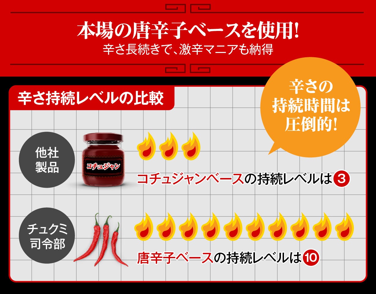 チュクミ司令部は唐辛子ベースを使用し、「辛いもの好きも納得の辛さ」をとことん追求しました。