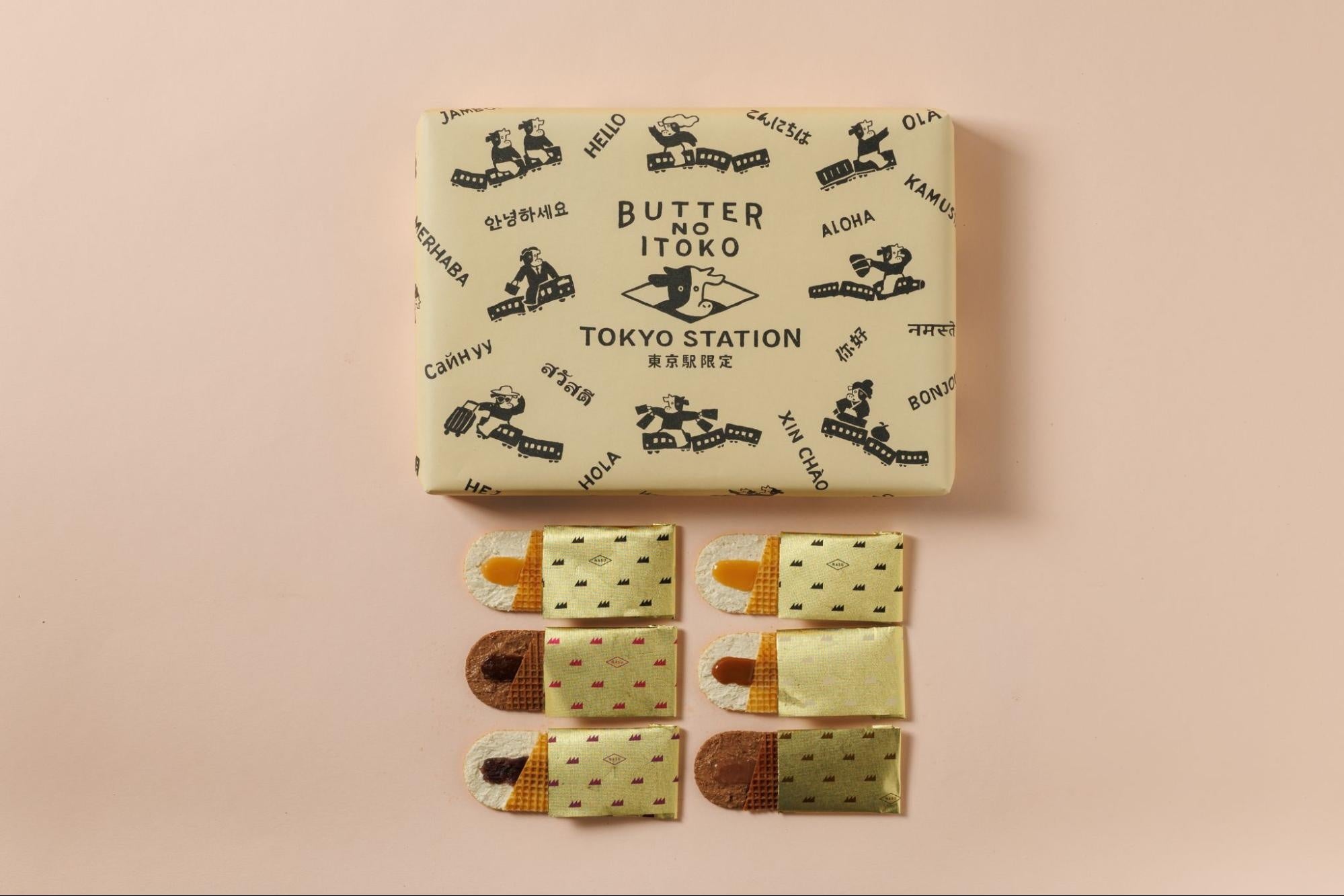 日本の玄関口の中心となる東京駅八重洲中央店の限定商品。東京駅という世界から様々な人が行き交う場所の限定商品として「こんにちは」を様々な国の言葉で散りばめました。「こんにちは」から始まる新しい出会いを作ってほしいという想いが込められています。デザインには、バターのいとこキャラクターの“いとこちゃん”が、旅する様子を描いております。旅の出発点・中間地点・終着点とさまざまなシーンで利用される東京駅で、思い出の残るお土産になること間違い無い限定商品です。