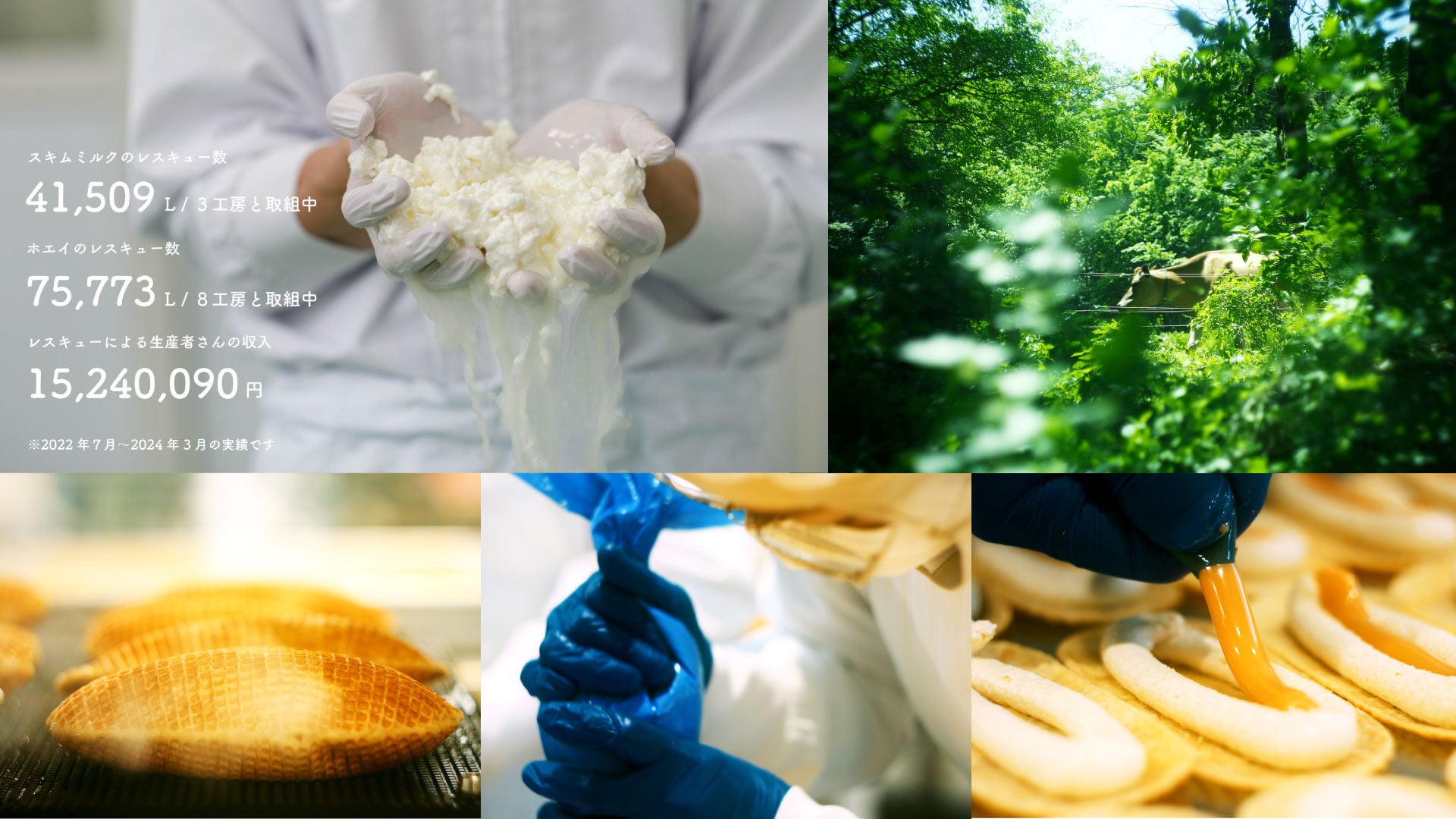 本来廃棄されてしまう副産物を、美味しいお菓子にすることで、生産者、観光客、地元が笑顔になれる「三方良し」の取り組みを目指しています。現在では、多くの方にGOOD NEWSに携わっていただき提携する3つの牧場からスキムミルク、ホエイを全量買い取りできるまでになりました。東京駅店では、これまで買い取り=レスキューさせていただいたスキムミルクやホエイの総数量を掲げてまいります。日々買い取り数量が変化する中で、最新の情報を掲示することでお客さまと一緒に生産者さんへの応援の姿勢を体現してまいります。